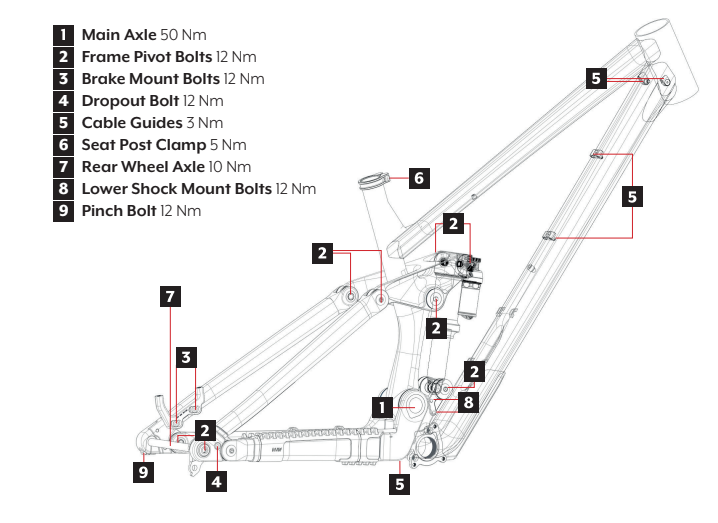 All frame bolts require a specific torque setting that are shown in the image below. Under- or over-tightening bolts may result in damage to the components. The brake mount bolts need to be assembled with medium thread-locker. The frame bolts require grease on the contact surfaces and a small amount of medium thread locker on the threads. The cable guide bolts should be greased before assembly.