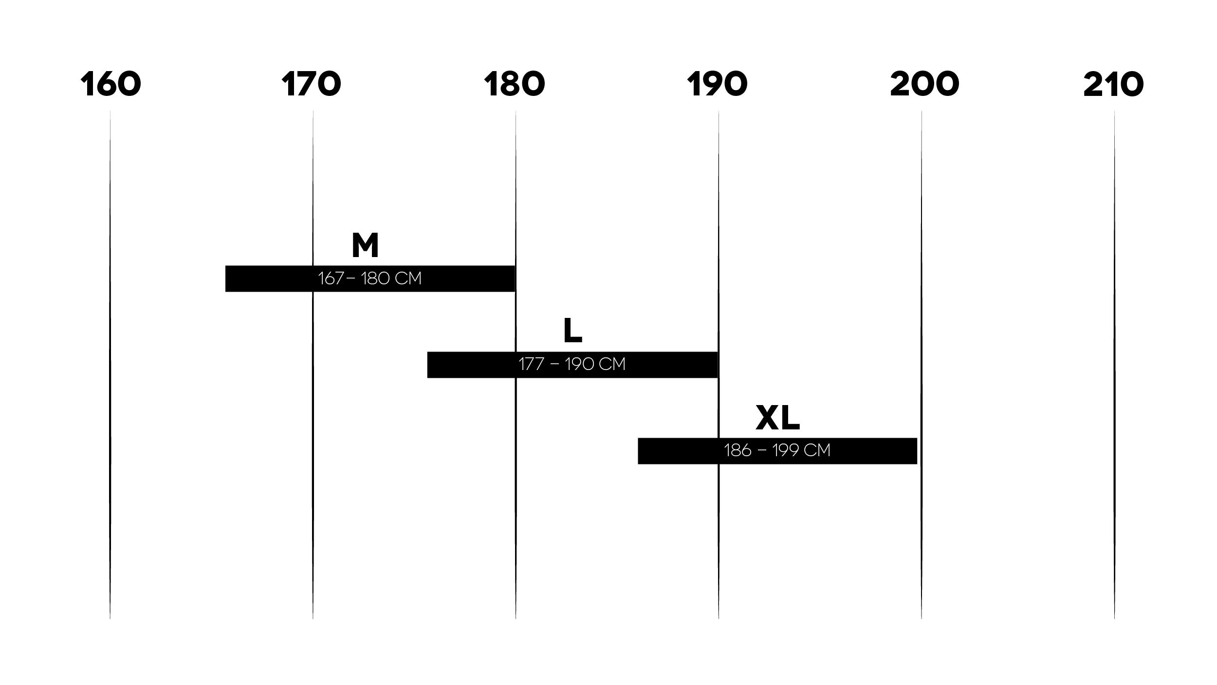 In the graphic below, you can see our size recommendations based on height. Choosing a size within the suggested range ensures a good fit.