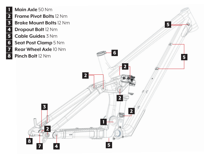 All bolts on the frame must be tightened to the specified torque to prevent damage to the components. The recommended torque values can be found in the graphic below. Be careful not to overtighten or undertighten the bolts.